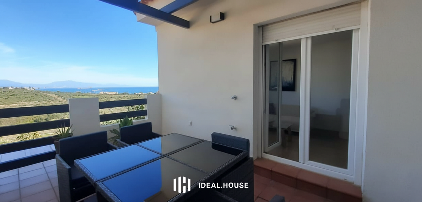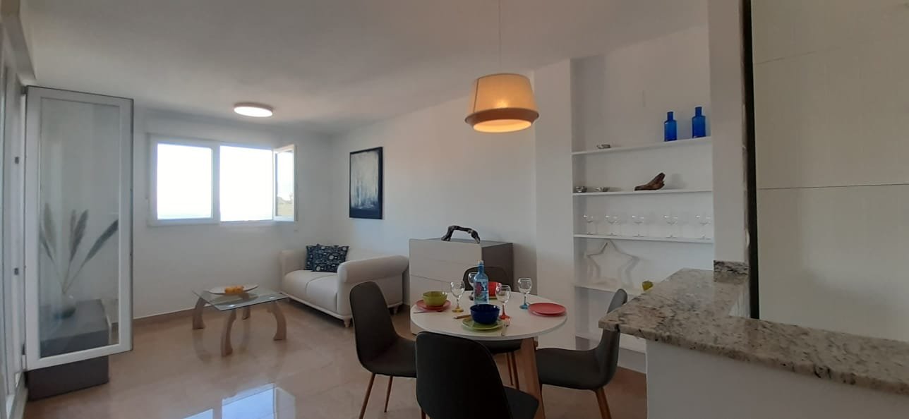 Desde el salón se disfrutan vistas despejadas a la urbanización y, al fondo, al mar. Además, tiene acceso directo a una terraza de 8 m² con preciosas vistas al Mediterráneo, un espacio perfecto para empezar el día con un café o relajarse al regresar a casa.