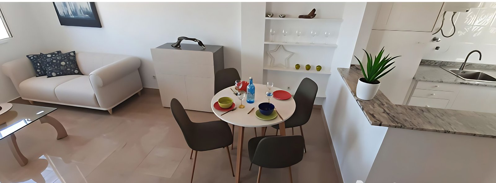 Las paredes blancas, las puertas blancas, el suelo de mármol beige claro y la abundante luz natural crean un ambiente luminoso, fresco y acogedor en toda la vivienda.